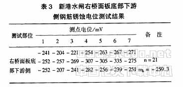新港水闸右桥面板底部下游侧混凝土钢筋锈蚀电位测试结果见表3。在检测表面抽检了21个测点,电位范围-202mV~-335mV,平均电位-259.3mV,钢筋基本处于全面锈蚀状态,局部处于严重锈蚀状态。在钢筋处于严重锈蚀状态的地方混凝土表面疏松开裂,混凝土保护层很容易地剥落,打开混凝土保护层,里面钢筋锈蚀十分严重,钢筋锈蚀层较厚且容易剥落,经测量钢筋的有效截面积只为原始截面积的60%左右,将严重地危及的安全。