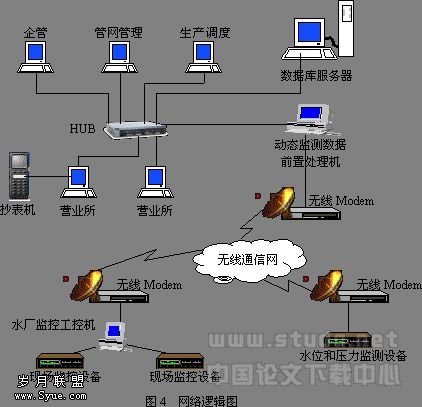 系统主要基于供水企业内部,并包含动态监测的远程无线通信网络。网络逻辑如图4所示。