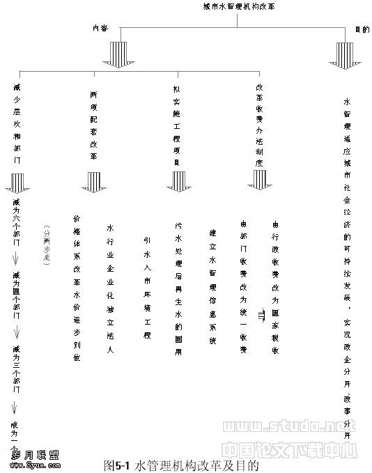 水管理机构涉及政府部门、和事业单位,其中政府机构改革是关键。为适应新形势的需要,我们的目标首先是克服目前政府水管理部门存在的弊端,合并职能部门,减少管理层次,提高管理效能,建成精干、高效的政府管理机构,以推进城市水管理的全面开展。