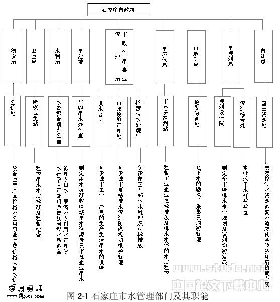 目前石家庄市从事水管理的有9个政府部门,职能处、室、站、公司有12个,详见图2-1。从该框图中可看出各机构均有水管理的内容,但各自侧重点不同,其机构形成有原因,也是以往社会的需要。
