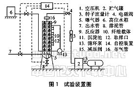装填密度是指生物膜与载体所占容积与整个反应器容积之比。在分别做了最大装填密度:37.5%、实用装填密度:30%以及较低装填密度:22.5%的对比试验后,确定较适宜的装填密度为30%。此时,反应器中的纤维载体的比表面积为2.66m2/L。