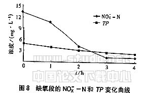 试验中实行半池出水、半池进水,使上一周期中产生的硝化液与新进原水混合,混合后NO-X浓度为13.42mg/L,浓度为268.46mg/L,TP浓度为4.81 mg/L。此时的厌 氧变成了缺氧,除磷菌可从NO-X中获取氧来进行缺氧吸磷。因此在缺氧段,在进行反硝化的同时,仍可继续吸磷(见图8)。