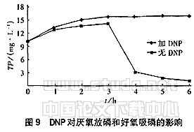 由图9可见,投加DNP后厌氧段的放磷量比不投加时增加了,而好氧段却没有磷的吸收。因此,DNP对厌氧放磷是有利的,而对好氧吸磷却有抑制作用。这是因为DNP是一种解偶联试剂,它对氧化呼吸链以外的磷酸化无抑制作用,只破坏利用O2或NO-X而进行的呼吸过程,从而抑制由传递而发生的ATP的形成。在厌氧段聚磷酸盐的分解代谢中ATP的产生是由于底物水平磷酸化,DNP对其无抑制作用,故有PO3-4的释放和PHB的合成;而在好氧段时,在有氧的条件下PHB将分解,并通过呼吸作用进行电子传递而产生能量,但由于DNP的存在,破坏了ATP的生成,所以 PO3-4不能与ADP结合产生ATP,也就产生不了聚磷酸盐,废水中的PO3-4不能被吸收,也就得不到去除。