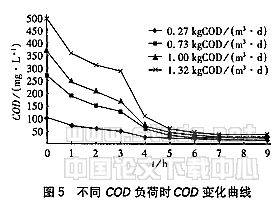 由图5可知,软性填料序批式生物膜法可承受较高的负荷,且在厌氧段有较高的吸收速率。在进水负荷为1.32kg/(m3·d)(相应进水浓度为496.8mg/L)时,厌氧段吸收值为212.5mg/L;而进水负荷为1 kg/(m3·d)(相应进水浓度为375.0mg/L)时,吸收值为203.1mg/L,这说明在进水负荷为1kg/(m3·d)时,厌氧段吸收值已趋于极大值,并表明了不是所有的有机物都可以作为细胞的合成物质的。所以,笔者确定该工艺适宜进水负荷为0.27~1.32kg/(m3·d)。