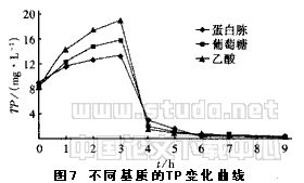 试验比较了在相同进水负荷[1kg/(m3·d)]时,分别以蛋白胨、葡萄糖、乙酸为基质的TP变化情况(见图7)。
