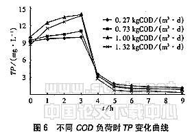 试验中,采用4种进水负荷考察、TP的变化(见图5、6)。