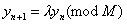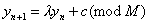 其中初值y0,乘子c和模数M取非负整数,当c=0时