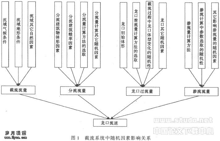 在组织设计阶段要考虑截流成功的把握性有多大,就此要对截流的风险有一个明确的认识。立堵截流过程中有两类风险存在,一类是戗堤堤头发生坍塌的风险;另一类是截流材料能否抵抗水流的冲刷而保持稳定的风险。前一类主要发生在低流速大水头状况;后一类发生在大流速低水头状况。对于在枯水期进行截流的工程,后一类风险是主要的;因此 ,在这里针对此类状况的截流系统风险度进行分析和研究。截流系统存在风险是因为系统受到很多不确定性因素的影响,归纳这些因素并分类如下: