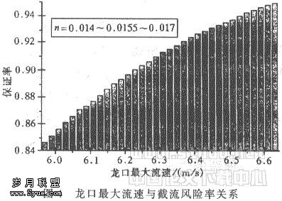 从计算结果可以看出,设计龙口最大流速的保证率在既考虑水文不确定性又考虑水力不确定性情况下,只有85%左右,即风险率为15%。根据设计规范中截流采用旬平均流量10%概率的标准,取既考虑水文不确定性又考虑水力不确定性的截流系统风险10%时,最大龙口流速需取6.23m/s。
