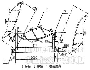 样,每隔25mm距离求得相应的弧面座标值,然后由数控切割机编程切割,下料后的隔板与曲面护角的内弧面顶紧检查其不吻合值。如间隙超过2mm,要对隔板的弧度进行修正,直至隔板曲线与护角内弧面曲面吻合为止。将制造合格的护角,隔板及筋板三种部件在专设胎具上进行拼对。拼焊组装胎具要便于检查和施工,拼装胎具设计时应满足护角在组装和焊接时不同工位的加工要求。分段护角在拼装胎具平放位置将有关部件组装在一起,然后根据焊接位置的需要,将已拼装好的护角旋转到最佳焊接位置进行焊接,以便制成整节护角,其拼装旋转胎具的构造及作用原理详见图3。 |
