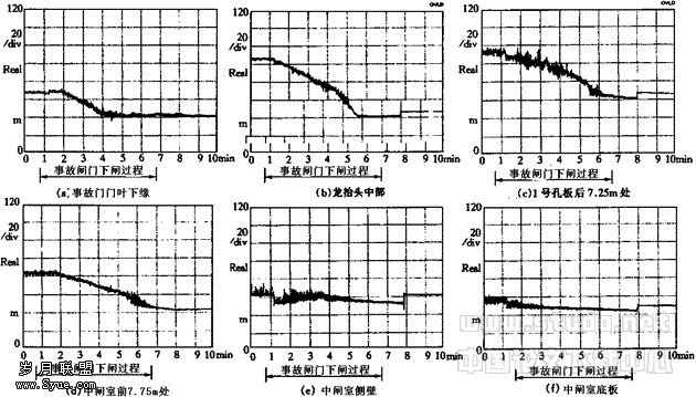 在整个事故闸门下闸过程中,事故闸门下缘的脉动压力曲线除了闸门开启时有一明显振荡外,其它时间内均呈单调下降趋势并最终稳定于大气压强(参见图4a);在龙抬头段,脉动曲线均单调下降并最终趋于一稳定值,压强变幅很大(见图4b);在孔板段,各测点具有较大的脉动压强(参见图4c);在中闸室闸门前的7.75m断面的侧壁上,脉动压力随事故闸门的逐步关闭有增强的趋势,并在事故闸门完成关闭前1分钟左右达到峰值(见图4d)。该处距中闸室较近,其压强脉动可能是造成中闸室工作间楼层地面有振感的重要原因;在中闸室水舌落水区的侧壁和地板,事故闸门下闸过程中泄洪洞内流量变化快,水舌落水区位置变化大,导致了测点压强的不稳定和较大的脉动变幅(参见图4e和4f)。