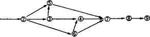 对如图1所示PERT网络,顺其箭线方向,在每一节点,对路线进行合成。通过合成,得各节点最早时间或该节点紧后工序的最早开始时间。在图1所示的PERT网络的节点可分为三类。第一类为只有一条线路汇入的节点,如节点2、3、6、8和9;第二类为有、且仅有二条线路汇入的节点,如节点4和5;第三类为有二条以上线路汇入的节点,如节点7。