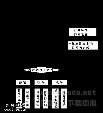 我们将前一个层次置于优先地位,为必须满足的条件;后一个层次处于次要地位,若干涉检查到一定次数仍未满足,就放弃,否则代价太大。标注干涉的检查,主要以标注文本包容盒和其它图素的包容盒是否重叠及重叠程度为依据。通过标注控制点和标注文本定位点在其可标注域内的移动、再定位、检查判断,直到最终找到合适的控制点和区域。