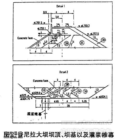 大坝的防渗由位于堤坝上游面(1.5:1)的钢筋混凝土板来保证。此混凝土板厚度将在坝顶沿着最低的坝基触点,在0.66m-0.30m之间成比例改变。坝基需建于坚固完整的岩体上。