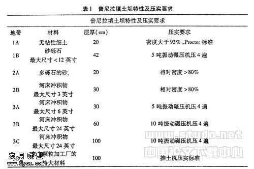 普尼拉大坝是混凝土面板堆石坝。坝顶高程为74.5m,底座高程为62m,即坝高136.5m,为智利最高的坝之一。土石坝填筑物主要是由Nuble河和Los Sauce河汇流处河成阶地的砂砾石填充。表1显示了使用的填筑物特性及大坝断面的压实要求: