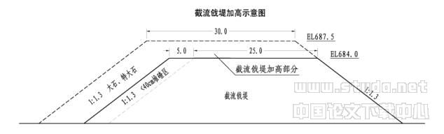 主要措施:上游侧增加5m大石和特大石护坡、戗堤顶加高到高程687.5m,具体见下图。