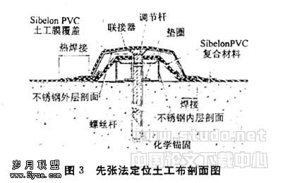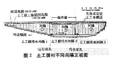由瑞士Carpi Tech SA提供的土工膜,由柔韧的聚氯乙烯隔膜组成,在制造过程中平面染色和热压成土工织物 (100%的聚脂)。土工膜的作用是防渗,土工布的作用是保护土工膜聚脂不被刺破使其相对稳定,土工膜放在土工布上,土工布是由塑胶聚和体组成,用于土工膜和大坝间的排水层(见图2),使排出的水由于重力作用流出,并且渗透到防水衬层垫和坝体之间,减少由于潮湿可能产生水蒸气压力,从而确保大坝稳定。?