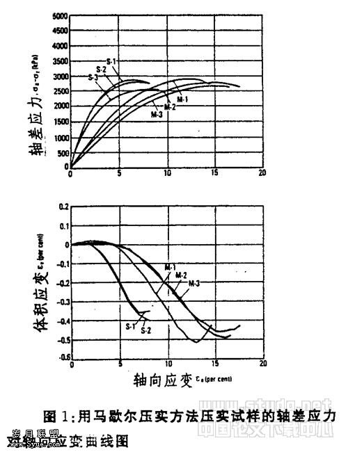 表2给出了试样参数及三轴压缩试验结果的概要。轴差应力为(σ?a-σ?r)对轴向应变和体积应变对轴向应变的曲线分别见图1,图2。σ?a指轴向应力,σ?r指径向周围应力,其值在整个试验中保持1MPA不变。每种压实方法需制备3个试样。图3所示为用5种方法压实试样的平均应力—应变曲线,其中4种为实验室压实,一种为现场压实。表2给出了平均值概要。表中所提弹性模量的值为轴向应变接近1%时的正割值。