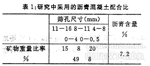 式中Pi为小于等效粒径颗粒所占重量百分比,di(见表1)最大粒径限制在16mm,和通常现场应用一样。骨料为压碎的石灰岩(比重为2.72),填料由石灰岩粉末组成(比重为2.74)。总的填料含量(<0.075mm=为矿物重量的12%。所用沥青为B180级,相当软,由85.5%的B85和14.5%的MB1000组成。沥青含量为总重量的6.7%(为矿物重量的7.2%)