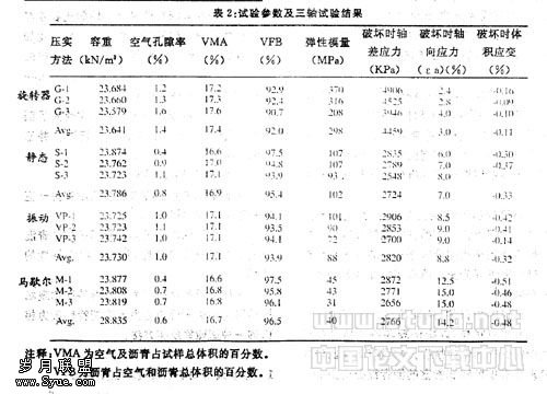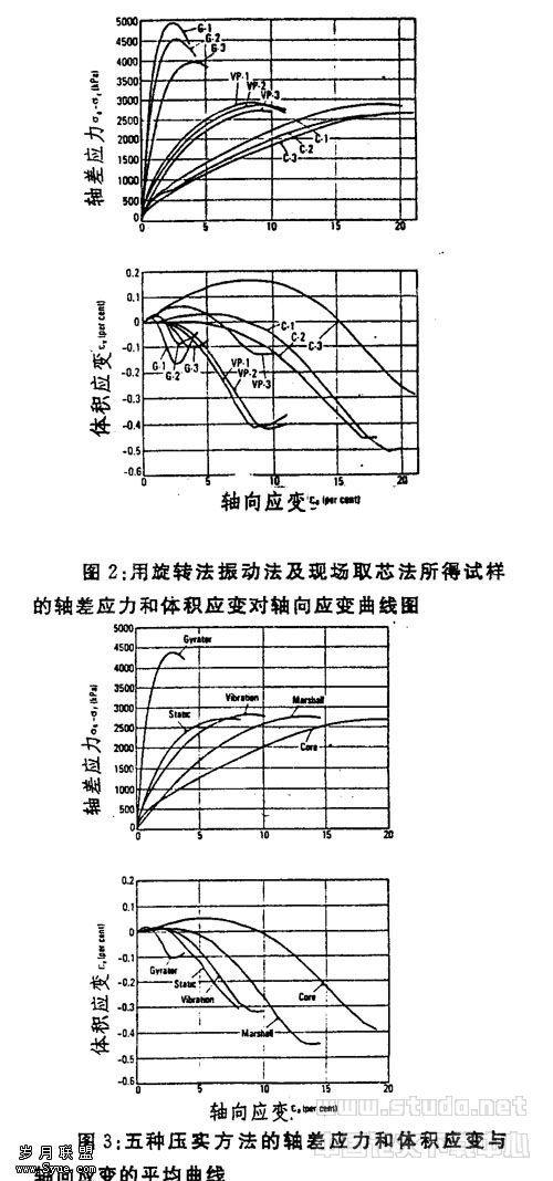 用其余三种实验室压实方法压实的试样与现场试样的强度差别不大,但破坏时的弹性模量和轴向应变差别较大,轴向应变接近1%的正割弹性模量从采用静态压实时的100MPA到现场震动压实时的50MPA和马歇尔法测定压实的40MPA不等。破坏时相应的三组平均轴向应变分别为7%,18%和14%。采用旋转压实的试样正割弹性模量约为300MPA,破坏时的轴向应变为3%。此外采用旋转器法压实的试样显示峰值过后应变减弱,而其它方法压实的试样具有柔韧的特性。(当三轴试验采用橡胶膜套住试样时这种强度上的减小不太明显,如附录所述)。