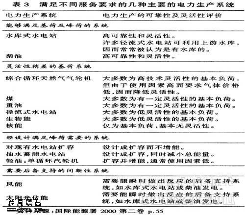 为了能够应付电力需求的波动,通常会将几个电厂结合起来使用,它们各自为保证供电的连续性而发挥不同的作用。表3对此作了说明。一些电厂适合于用作基荷电厂,而另一些则作为峰荷电厂。例如,核电厂通常保持固定的输出,一般让它们来负担基本负荷。相反,按照不同的设计,水电厂可以满足不同的电力需求,可以是基荷或是峰荷,甚至可以做到同时都满足。这种供电的灵活性正是水电、柴油和天然气的特性之一。
