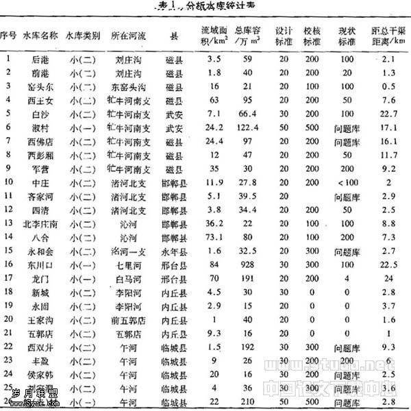 根据水库的基本资料,技术指标,目前存在的问题以及距总干渠的距离等因素,对所有水库进行摸底。在粗略筛选的基础上,对选定的水库进行了现场查勘与调查,注重客观实际,并与地方和管理单位进行协调,综合确定可能溃坝的水库。分析主要遵循以下原则:1)现状标准小于或等于100年的水库;2)无现状标准和校核标准,且通过估算和分析认为水库现状标准低于100年的水库;3)大坝有较严重质量问题的水库。4)存在上游水库溃坝洪水威胁的下游水库。同时还要考虑距总干渠的距离,一般情况小(二)型水库在20 km以内,中型和小(一)型水库在50 km以内。对于控制面积较小或库容较小,并且处于100 km2以上河流支流上的水库,虽然符合上述几个条件,由于溃坝流量相对河道100年设计流量相对较小,不再进行分析。根据水库的现状调查情况和上述原则,对水库的标准和存在的问题进行了细致的分析,确定了26座可能溃坝的水库,涉及河流12条(表1)。