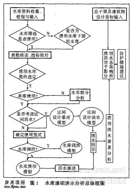 整个分析过程包括:基础资料分析和水库的筛选排查、分析计算、影响分析及预防措施建议。1)在众多的水库中,根据水库的基本情况、技术指标和存在问题,分析在总干渠标准(100年)情况下有可能溃坝的水库,确定溃坝形式;2)根据各水库的具体情况,分析是否进行设计洪水计算和水库调洪计算确定溃坝指标、水库溃坝分析及洪水演进分析、区间洪水分析及洪水组合分析;3)溃坝洪水对总干渠影响分析、提出防护措施建议。详见图1。