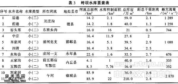 总干渠河北省南段受水库溃坝洪水影响的渠段约11 km,具体位置在磁县的7+000至11+000段、邯郸县的46+000至48+000段、内丘县的140+000至142+000段和临城县的165+000至168+000段共4段。刘庄沟、东窑头沟、渚河北支、 河一支、前五郭店沟、五郭店沟和午河的交叉建筑物将受到一定的影响。