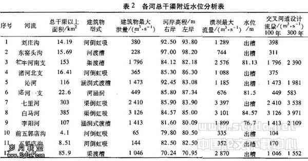 通过对26座水库不同条件下溃坝洪水、洪水演进、与区间洪水组合以及洪水到达总干渠洪水位的系统分析,并结合总干渠有关指标进行了对比(表2),在表2可以看出下列情况。