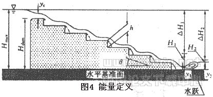 为求得台阶式溢洪道的消能率,分别取溢洪道上游(水库)和其下游的跃前断面(参见图4),应用伯努力方程可得到: