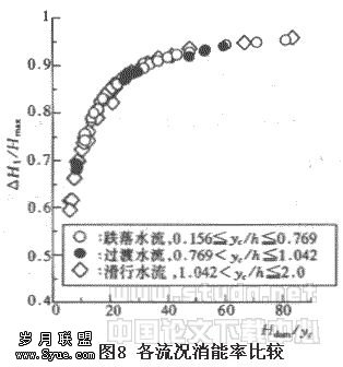 进一步将倾斜角度θ=19°时的台阶式溢洪道各流况的消能率相比较,如图8所示。对于一定的Hdam/yc,滑行水流、过渡水流和跌落水流的消能率ΔΗ1/Hmax相差很小。这是因为在流量相对较小的跌落水流和过渡水流中,即便是流量发生变化,但主流冲击台阶的位置变化不大,因此,在台阶上所形成的三角形区域和形状亦变化不大,对水流的形状阻力影响较小。另外,在滑行水流情况时,当yc/h≤2~2.5时,形状阻力的影响虽然较跌落水流和过渡水流较小,但由于实际流过台阶表面的水深仍然较小,水流掺气非常充分,在台阶隅角形成稳定的,而且很强的旋涡,并在台阶外边缘附近形成随机性的空气层流态。虽然各流况时台阶上的能量H1中其静水头和动水头的比例有所不同[7],但台阶上的能量H1基本不变,这就使得各流况的消能率几乎一样。