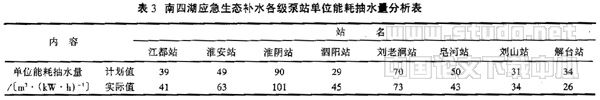 4.3.2 泵站单位能耗 表1在进行应急补水电量测算时,泵站能耗采用的是1997—2001年平均值。应急补水期间,由于各泵站加强管理,努力提高运行效率;同时由于冬季调水,沿线用水量极少,使得各区段输水水位坡降减小,因此,各级泵站的抽水扬程均有一定的减少。故泵站单位能耗抽水量较计划值有所提高,详见表3。8个梯级泵站加权平均每度电抽水量比计划多抽了4.84 m3,提高了10%。