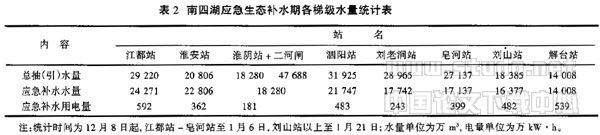 2002年12月8日,江苏境内8级泵站及相关水闸同时启动,应急补水开始。12月20日,入下级湖的水量3 000万m3,下级湖水位达到了向上级湖补水的要求,山东开始由下级湖向上级湖提水。12月24日,因淮河来水较多,淮阴站停机,洪泽湖以北的改为全部调淮水。2003年1月6日,应急调水长江至骆马湖段的调水任务完成,但继续向骆马湖补水。1月21日解台站停机,到1月24日下级湖的水量达11 540万m3,完成了应急补水江苏段的任务。3月4日,入上级湖水量5 052万m3,至此,向南四湖应急生态补水任务全面完成。
