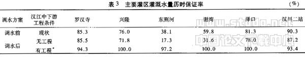 将调水后汉江中下游干流供水范围的取用水情况与调水前相比较,可以得出调水后对干流供水范围的影响程度。分析水文系列采用1956年5月至1998年4月,水平年2010年,分析要素为:对闸站分析其设计水位保证率,对灌区分析其灌溉水量历时保证率和供水水量保证度,分析比较基础为丹江口水库初期规模引水15亿m3的调水方案,计算方案为丹江口水库加高至后期规模汉江中下游无工程条件下或者汉江中下游有工程条件下的调水方案,汉江中下游无工程条件指汉江中下游的取水设施维持现状,汉江中下游有工程条件是指汉江中下游在调水的同时安排进行沿岸部分闸站的改造扩建、兴建兴隆枢纽、引江济汉工程以及部分航道的整治。具体计算方法为:(1)根据预测的农业灌溉定额和灌溉面积、城镇及生活用水定额,与当地可利用水平衡后,计算得出需取汉江干流的长系列旬流量过程。(2)根据丹江口水库下泄过程,与各小区用水过程进行平衡,可以得出各小区在汉江中下游无工程条件或有工程条件下的可取水过程。(3)将调水前后的取水过程进行比较,可以得出汉江中下游干流供水范围的影响程度。
