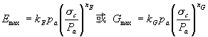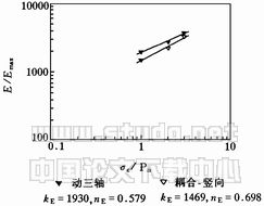 将试验所得到的应力幅值与应变幅值之间关系进行坐标变换后,可以整理出1/E~ε、1/G~γ之间的相互关系,发现其间呈现良好的线性关系,说明应力幅值与应变幅值之间服从良好的双曲线关系,由各直线截距a的倒数确定各模量最大值Emax和Gmax,进一步地确定模量最大值与固结压力之间的依赖关系,如图4和图5所示,由此可见最大模量与固结压力之间的关系基本符合Janbu的经验表达式,即