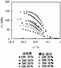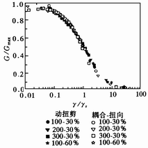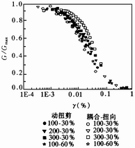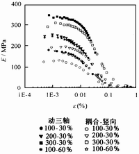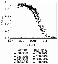 从材料力学意义上,弹性模量可认为单向受力时应力与应变之比,三轴试样在固结后只承受轴向荷载作用,在弹性阶段其轴向应力与应变之比即应为弹性模量;而剪切模量虽然一般是在纯剪应力状态下定义的,但可以证明在任意非纯剪面上的剪应力与剪应变之比恒等于剪切模量。因此当单元体的某一个面上同时受到正应力和剪应力的共同作用时,轴向应力与轴向应变之比不一定等于单向应力条件下的弹性模量,但其剪应力与剪应变之比仍应等于剪切模量。上述试验结果表明:在双向耦合循环剪切振动条件下,动剪应力幅值与动剪应变幅值之比与动扭剪试验所获得的动剪切模量基本相同,与动三轴试验间接所获得的动剪切模量也基本一致。