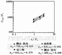由图4可见,由双向耦合循环试验中竖向应力-应变关系所得到的最大动弹性模量与由动三轴试验所得到的最大动弹性模量结果相差较小,对于不排水试验,取泊松比ν=0.5,依据弹性理论,可由动弹性模量和轴向应变换算得到动剪切模量和剪应变,进而根据动三轴和动力耦合试验轴向分量间接推算出最大剪切模量,并与动扭剪、动耦合试验扭转分量所直接确定出的最大剪切模量同时绘于图5中。由图5可以看出:由动扭剪试验直接确定最大动剪切模量与由动三轴试验结果间接推算所得到的最大动剪切模量十分接近,由动力耦合剪切试验扭转分量所确定的最大动剪切模量偏高一些,而由动力耦合剪切试验竖向分量所确定的最大剪切模量又稍低一些。