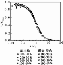 对动弹性模量和动剪切模量均以各自的最大动模量进行归一化处理,由此得到归一化动模量随应变幅值的变化关系。图6给出了由动三轴及动力耦合剪切试验竖向分量所得到的不同固结压力和不同相对密度条件下的归一化动弹性模量与轴向应变之间的关系即E/Emax~ε关系。图7表示由动扭剪及动力耦合剪切试验扭转分量所得到的不同固结压力与不同相对密度条件下的归一化动剪切模量与剪应变之间的关系即G/Gmax~γ关系。由图可见由普通动三轴或常规动扭剪试验所得到的归一化动模量与应变幅值之间的关系分别与由动力耦合剪切试验两个振动分量所得到的试验结果规律性一致,经归一化处理后,由3种试验所得到的无量纲动模量比与应变之间的关系基本不依赖于初始密度,而且与初始固结压力之间的关系也不明显。若采用正应变εr与参考剪应变γr对上述关系进一步进行归一化处理,所得到的E/Emax~ε/εr及G/Gmax~γ/γr归一化关系分别如图8与图9所示,由图可见,经归一化后的动模量比与应变比之间的关系与初始固结应力及初始密实度均无关。于是,尽管试验应力路径不同,但动模量比与应变比之间的依赖关系是唯一的,可以认为对于动力耦合剪切条件下砂土的动力变形特性依然可套用单向振动时所取得的动力模量参数。