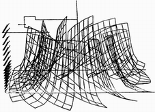 3.2 混流式水轮机转轮叶片实例 (由延长后的结果构造叶片空间网格)由此可以看出,通过对拟合结果的平面延展,可以得到0-0断面以上、16-16断面以下数据缺少的部分的型值点,通过与已知断面数据的比较,交线数据光滑平顺,同时证明了延长、拟合算法的可靠性、合理性。下附转轮网格图如图3,4,5。