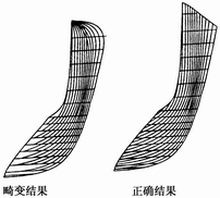片时如果不能确定曲面边界?,则可能会出现畸变结果,如图2所示,由图可以看出两点,首先叶片不完整,叶片将不能和上冠相交;另外拟合得到的叶片的空间几何形状与实际形状产生严重偏差,出水边与上冠和叶片的交线混为一体,造型失败。这问题的解决也有赖于采用延展方法来确定曲面边界,即进水边、叶片与下环的交线、出水边、叶片与上冠的交线4条空间曲线。 |