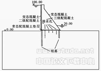 3.1 概况 某碾压混凝土重力坝,坝高102m,底宽70m,顶宽12m,上游水位100m,下游水位20m,在坝体中距上游面2?3m处设置孔径15cm,孔距4m的垂直排水幕,坝基设置2道深分别为30m、15m的主排水幕,中间2道深为8m的抽排水幕,其孔口高程为基础廊道底版高程,孔距、孔径都与坝体排水孔相同。假定坝体内自下而上每隔20m存在一个冷缝面,共4个,坝上、下游面分别设置0?3m厚的变态混凝土,上游面变态混凝土后有厚2m的二级配混凝土,建基面上设有2m厚的常态混凝土垫层。计算中当考虑防渗体水平开裂时,裂缝都贯穿于坝上游面的变态混凝土和其后的二级配碾压混凝土;坝上游面垂直劈头缝位置假定发生在两相邻排水孔的中间。图1为大坝的剖面图,利用水力对称性计算域在坝轴线向厚2m。计算域材料的渗透系数见表1所示,其中k∥和k⊥分别为坝体层面切向和法向的主渗透系数。