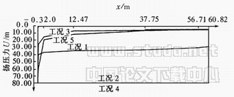 图7为各工况在坝体底部高程20m处缝面上的扬压力水头的分布图。