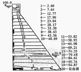 图4结果表明:(1)坝内水头线呈水平状分布,排水幕不但对坝体进行了充分的排水降压作用,而且也充分地截止了从水平缝面集中渗入的高压力库水,确保了大坝的安全性;(2)在坝底部距坝建基面20m高程处,由于库水压力大和防渗体裂缝与坝内缝面的直接相连,排水幕未能完全截止从库水渗入的水流,缝面上残留有约13~15m水头的扬压力;(3)比较图3和图4,得知确保排水幕能正常工作对大坝安全性是何等的重要,建议工程实践中孔径可适当大一点,不宜小于15cm,确保排水孔的永久畅通性;(4)在图4极端情况下,坝底部缝面上才有一定的扬压力,说明目前工程实践中排水孔间距取3~4m是较合适的。