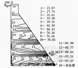 图6为工况5的结果,(1)即使在图5极端情况下,当坝内设置了排水幕后,坝体渗透水流还是得到了较充分的排水降压,除缝面局部区域外,层面上扬压力几乎为零;(2)由于劈头立面缝与坝内缝面直接相连,尽管有排水幕的疏干作用,底部仍有部分集中渗漏现象,但此时缝面上扬压力仍得到了较好的控制,水头只有15~18m;(3)基于坝体底部冷缝面区有一定大小的扬压力的事实,当坝下游面有变态混凝土时,建议最好在坝体的底部范围内再添置1~2道具有一定高度的排水幕,充分疏干那里的渗透水流,尤其是在高坝建设中更要注意这一点。 |