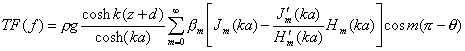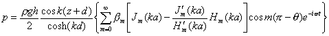 式中:ρ为流体质量密度;g为重力加速度;h为波高;d为水深;ω为圆频率;a为圆柱半径;k=2π/L为波数;L为波长;βm为常数,且有β0=1以及m≥1时βm=2im(其中:i2=-1);Jm及J′m表示m阶第一类Bessel函数及其一阶导数;Hm及H′m表示m阶第一类Hankel函数及其一阶导数,z为圆柱轴向坐标并以静水面以上为正,θ为相对于入射波方向的圆柱环向坐标,以顺时针转向为正,并以圆柱前沿为0°、后沿为180 °。由式(1)可以直接导出关于动波压力的传递函数:
