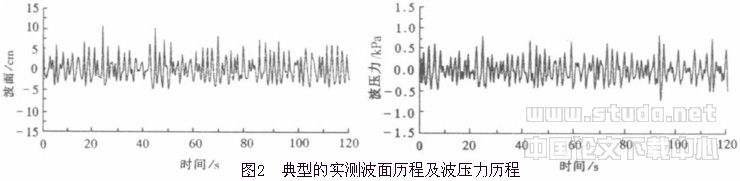 2.2 实验程序 分6种工况进行了随机波水槽实验,详见表1。为力求保证海床土不受前次工况实验的扰动,以充分模拟原状海床并达到海床特性在整个实验中的一致性,在前次工况结束之后,均拔出模型对淤泥进行较为彻底的处理,并令其恢复24h以后再进行下次工况的实验。考虑到在随机波作用下与海床的相互作用具有一段发展过程,对每次工况均以33.33Hz的采样频率连续采集3次数据,每次采集时间为240s。图1所示为实测规范谱和PM谱,图2为实测典型的波面历程及波压力历程。