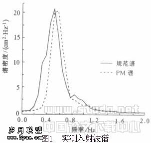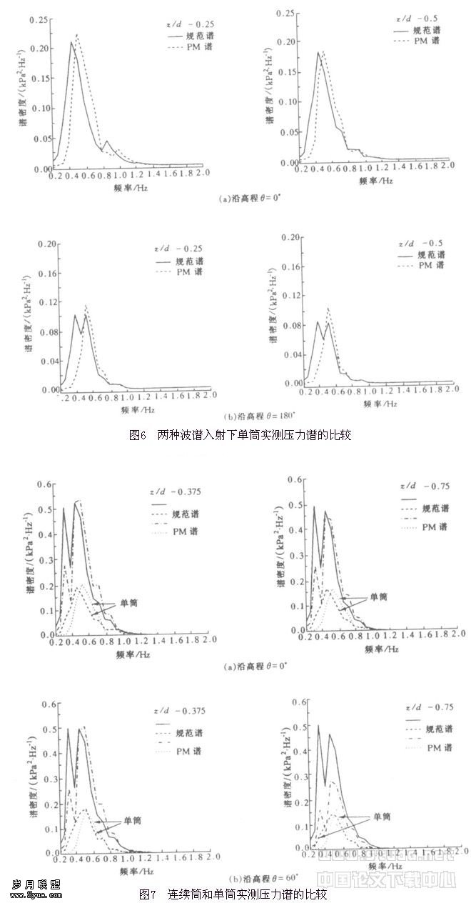作用。(3)在两种波谱输入下,单筒波压力谱的最大峰值均发生在静水面以下接近静水面处,此后峰值沿水深逐渐减小。在规范谱入射下的波压力谱要比在PM谱入射下的宽,说明波压力能量分布在较宽的频率范围,而在PM谱入射下波压力谱较窄,说明波压力能量相对集中,这与入射波谱的特性是一致的,证明波压力的能量分布与入射波的能量分布基本一致。(4)连续筒波压力谱的规律基本与其波压力传递函数的一致,其压力谱峰值远远高过单筒的峰值且谱形更为复杂。与单筒不同,在两种波谱入射下均出现显著的双峰现象。由波压力谱谱形的比较表明,连续筒的波压力谱也与入射波谱紧密相关。