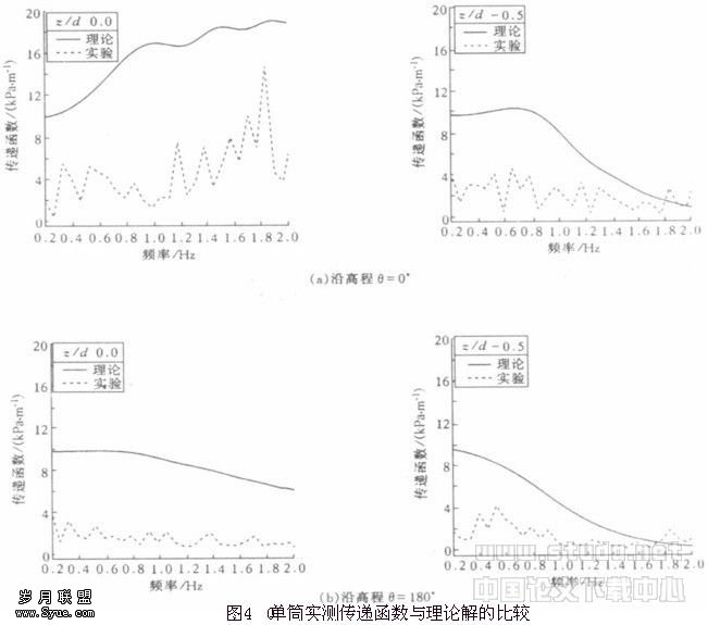 可以看出,所有测点的总体趋势与解析解较为一致,但幅度降低,且总体趋势的幅度变化较为缓和,除静水面外,相邻测点之间的变化不很明显。导致这种差异的可能的原因在于:(1)从实测数据计算出的传递函数存在一定误差,因为用实验方法获得系统精确的传递函数是较为困难的;(2)线性绕射理论适用于微幅线性波,当相对波高较大时,无法考虑实际的非线性效应的影响;(3)更为关键的是,在此—波浪—海床的耦合系统中,与海床之间的相互作用对圆筒表面的波压力响应起着十分重要的作用。在随机波浪作用下,圆筒将有可能随波浪逐步产生振动响应,由此对地基土产生作用,如果该作用不超出地基土的 弹性响应范围,圆筒将逐渐进入准稳态的振动状态。这种由振动响应导致的准稳态振动会大幅降低的波压力响应,并使表面各部位对波压力的响应趋于缓和和均匀。这与垂直固定于水槽底面的圆柱的波压力响应具有明显区别。