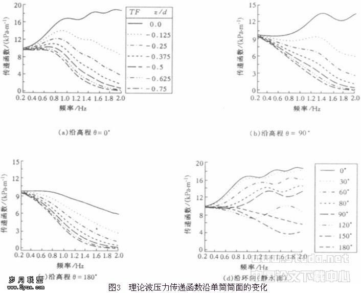 可以看出,在我们所关心的频率范围内,理论波压力传递函数均随高程的降低而减小,说明波压力响应随高程的降低而变小;除了在静水面附近,传递函数基本随频率的增大而减小;在静水面,θ=90°之前,亦即沿筒体的迎波面,传递函数随环向角度的增大而减小,并明显随频率的增大而增大。此外,在实验所采用的入射波峰频,亦即0.5Hz~0.6Hz附近,无论是沿环向还是沿高程,传递函数的变化幅度都不剧烈。