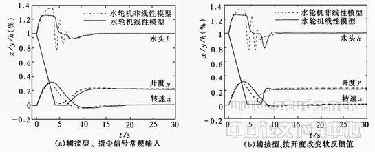 水轮机在甩负荷过程中,一般要经历水轮机工程、制动工况及反水泵工况。目前仅有极少数水轮机有全特性曲线,而综合特性曲线仅反映水轮机工况。采用水轮机特性预估的方法可以计算出水轮机的力矩特性和流量特性,但其结果仅在高效率区与实验特性曲线相近,高效率区之外存在缺陷。水轮机的高效率区特性具有一定的变化,不同水轮机的非线性模型在高效率区之外则存在较大差异,不易掌握其规律性,在研究调速器控制性能时,希望排除其他不确定因素。从图5可以看出,在调速器控制方式、调节参数等条件相同的条件下,非线性水轮机模型在高效率工况(水轮机工况)与线性水轮机模型仿真曲线变化趋势基本一致。因此,用线性水轮机模型来研究机组甩负荷过程中的调速器控制性能所得到的结果具有代表性。